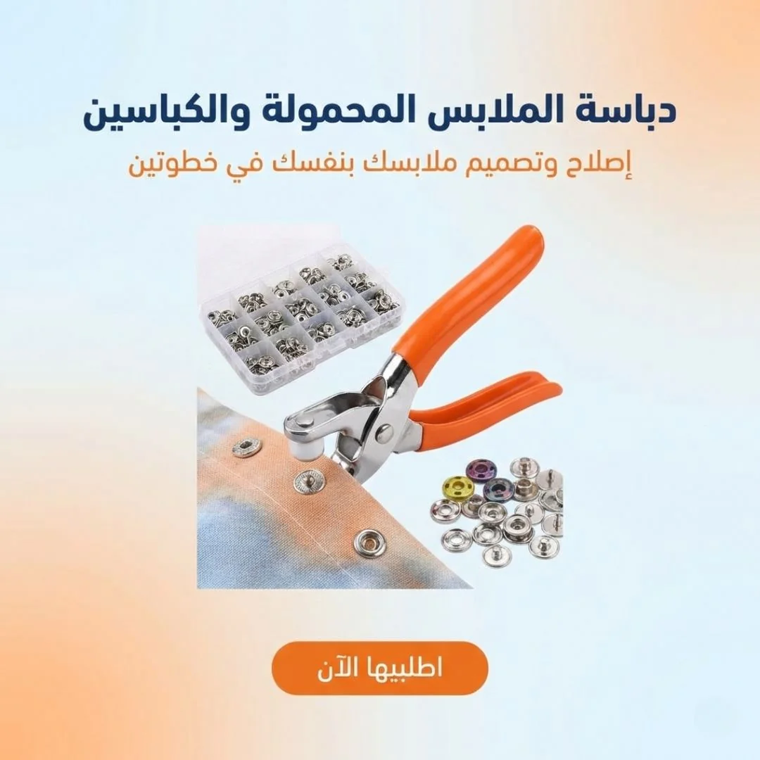 مع اداة Snap Kit هتنسي مشوار الخياطة لانك بكل سهولة هتقدري تعملي دا بنفسك بخطوتين وبدون تكاليف. الحجم :- 14.5*7.5سم العبوة تحتوى على :- 150× مجموعة من الكلبسات 1 × دباسة ملابس snap kit المميزات :- -مصنوعة من الفولاذ المقاوم للصدأ -مناسب للمبتدئين أو المحترفين -مجموعة مميزة من الغرز الخياطة. خصوصا لو من هواه صنع ملابس اطفالك بنفسك -هتقدري تصلحي ملابس طفلك او ملابسك الخاصة بخطوتين وبشكل سريع -الكلبسات مصنوعة من الالاستانليس الغير قابل للصدا