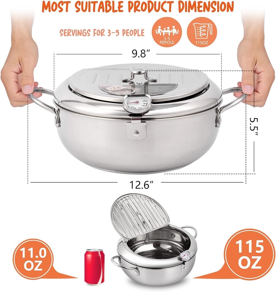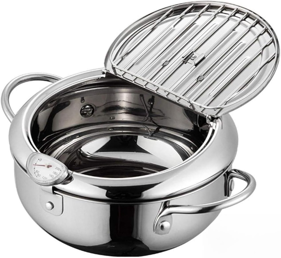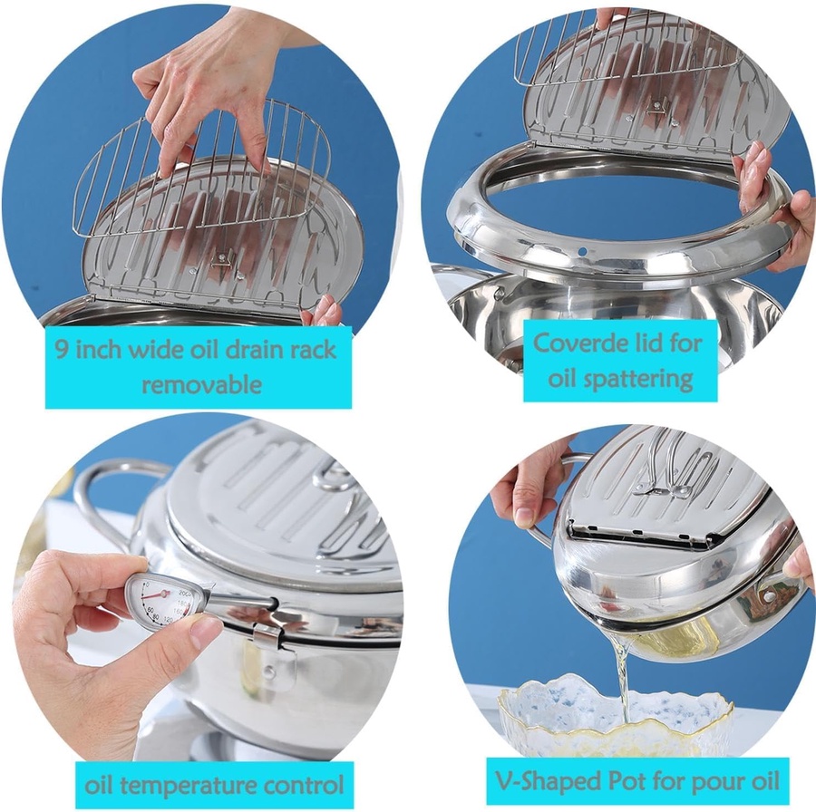 حجمها 2.2 لتر 🍟 **حلة قلي ستانلس ستيل مع ترمومتر** * 🥘 مصنوعة من **ستانلس ستيل عالي الجودة** مقاوم للصدأ. * 🌡️ مزودة بترمومتر لقياس درجة حرارة الزيت بدقة (من 50° لحد 200°). * 🥢 غطاء عملي فيه شبكة لتصفية الزيت من الأكل بسهولة. * 🔥 مناسبة لكل أنواع البوتاجازات بما فيها **الاندكشن**. * 🛠️ سهلة التنظيف ومتينة للاستخدام الطويل. * 🪄 السعة: **2.2 لتر** – حجم مثالي للقلي المنزلي. ✅ ممتازة لقلي البطاطس، الدجاج، السمبوسة، والوجبات السريعة بشكل متساوي وصحي أكتر.