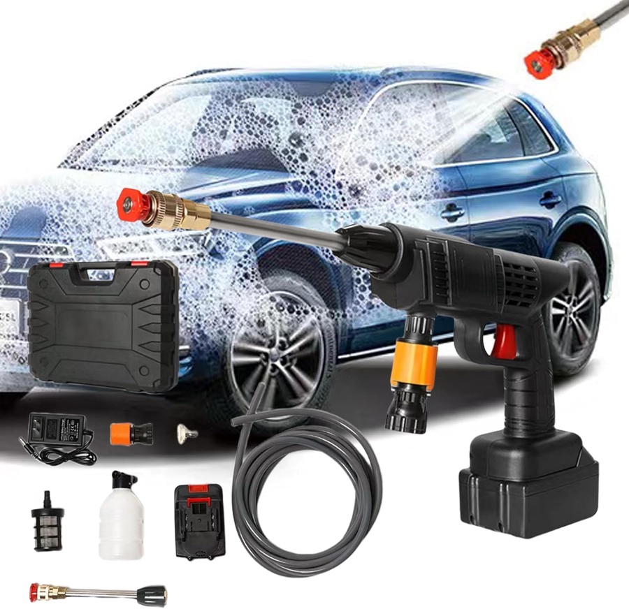 **المميزات والخصائص:** * ⚡ **بطاريتين 48V قوية**: أداء مستمر وقوي بفضل البطاريتين القابلة للشحن، تدوم لفترة أطول بدون انقطاع. * 💦 **ضغط ماء عالي**: يطلع مية بضغط قوي يشيل الطين والأتربة والعوالق العنيدة بسهولة. * 🧴 **زجاجة رغوة مدمجة**: تقدر تضيف سائل تنظيف وتغسل بالرغوة بضغط، كأنك في محطة غسيل سيارات. * 🧰